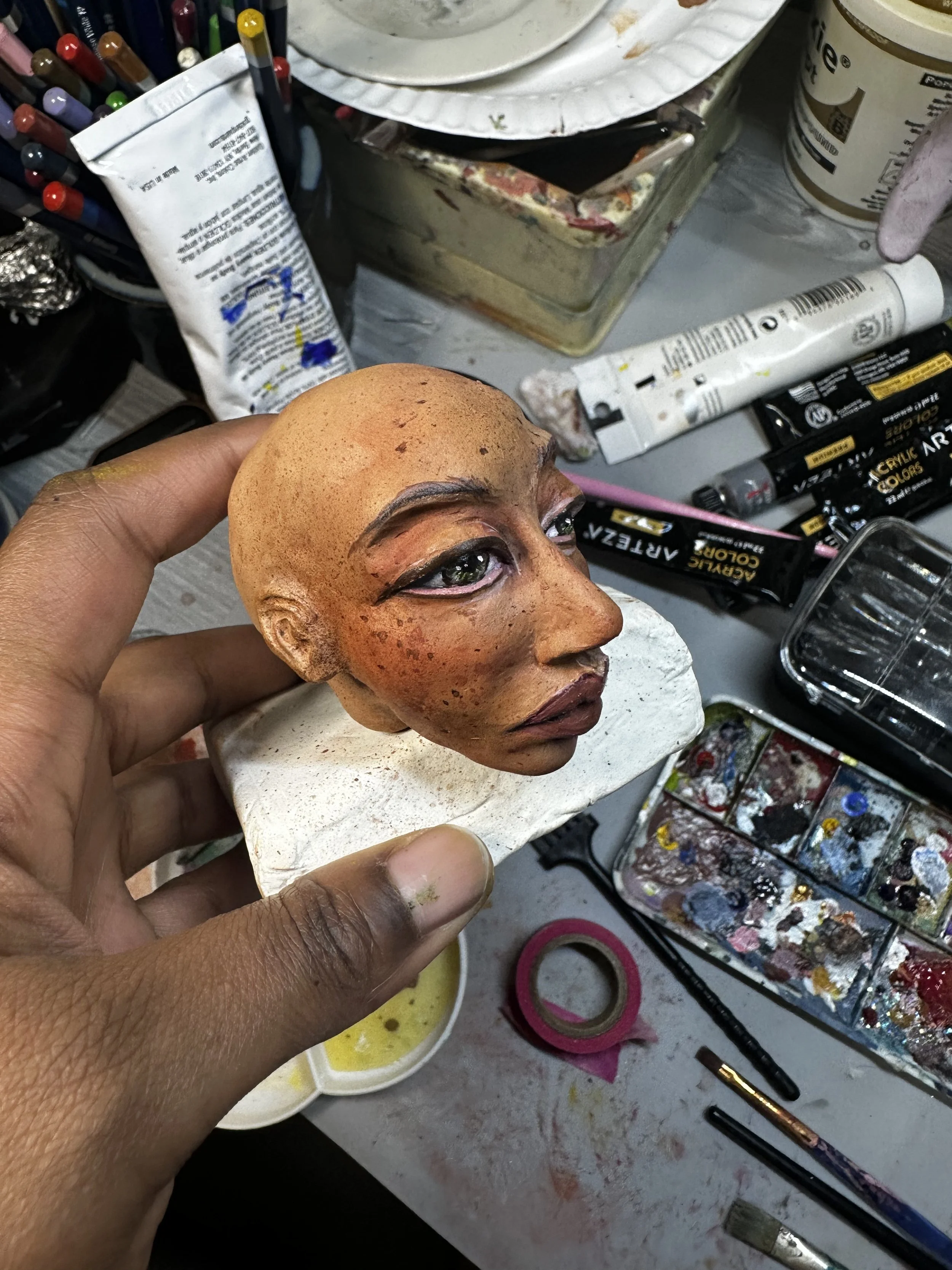 Finish face up of the head. Later, I went back in and simplified the eyes of the doll to make her stare more piercing. Less is more