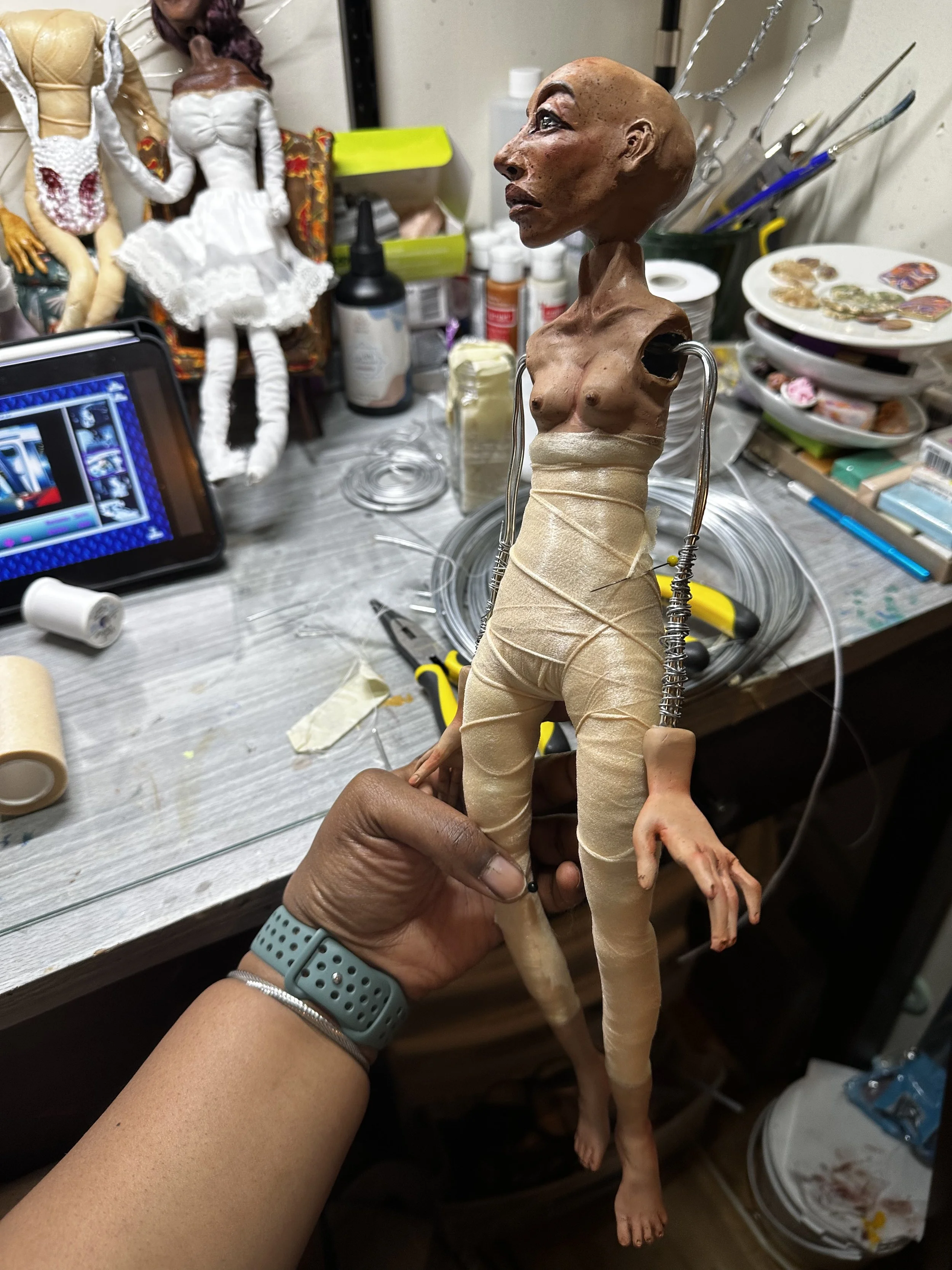 My biggest success over the weekend was assembling and constructing the body of my doll. I used a softer wire for the core of the body to make it easier for general movement. The padding is built out from cotton batting and athletic tape, and eventually a nude fabric will be sewn onto the body of the doll for a nice finish.